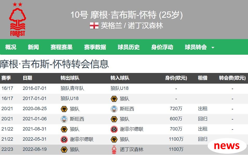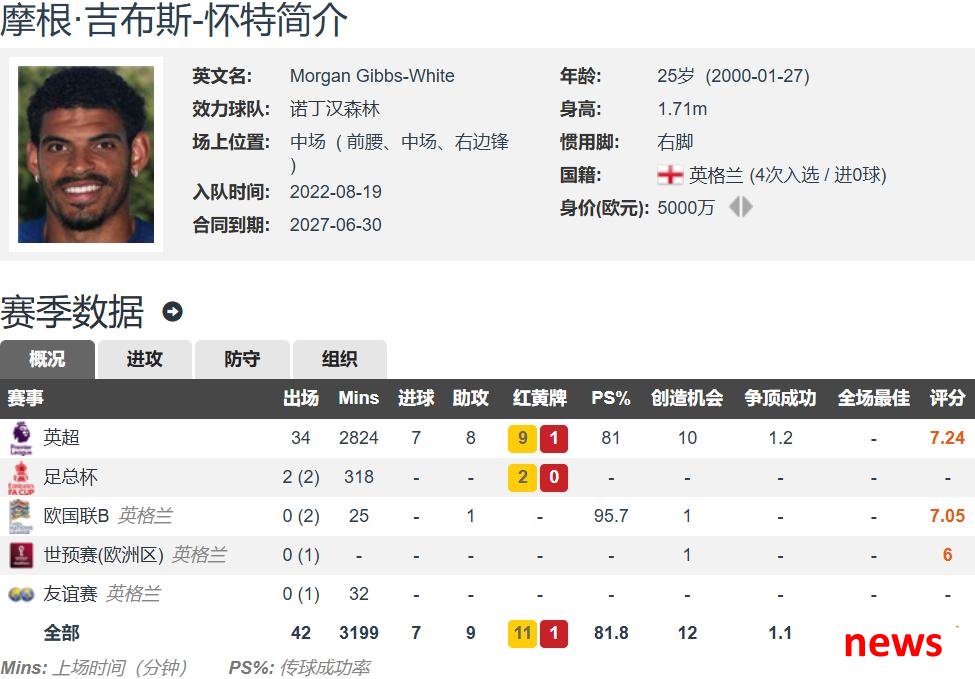 Gibbs Wyson đã 25 tuổi. Anh ấy vẫn là một người chơi Anh bản địa. Anh ta cao 1,71 mét và có một tiền vệ tấn công phải. Anh ấy có thể chơi ở tiền vệ phía trước, tiền vệ và cầu thủ chạy cánh phải. Anh ấy có một hợp đồng với Nottingham Forest cho đến năm 2027. Gibbs Wyson đã có 38 lần ra sân cho Nottingham Forest trong tất cả các cuộc thi mùa trước, bao gồm 36 lần bắt đầu và 7 bàn thắng và 8 pha kiến tạo, bao gồm 7 bàn thắng và 8 pha kiến tạo trong 34 trận đấu ở Premier League. Anh ấy đã thể hiện rất tốt, giúp đội đạt được vị trí thứ bảy tại Premier League và giành được Cup châu Âu (Hiệp hội châu Âu United).